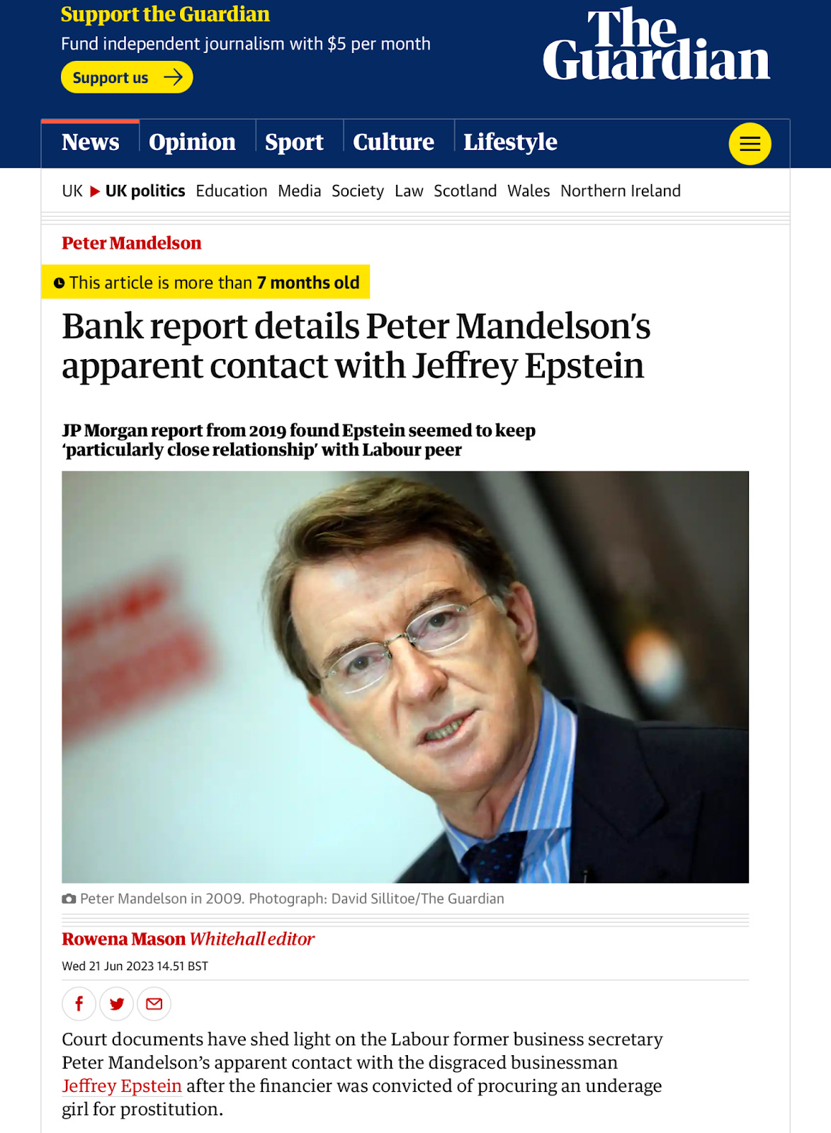 In June 2023, The Guardian reported on the victims’ lawsuit against JP Morgan Chase, Epstein’s bank of fifteen years. A 2019 internal report filed by the bank with the court in New York revealed that Epstein appeared to “maintain a particularly close relationship with Prince Andrew the Duke of York and Lord Peter Mandelson, a senior member of the British government.”