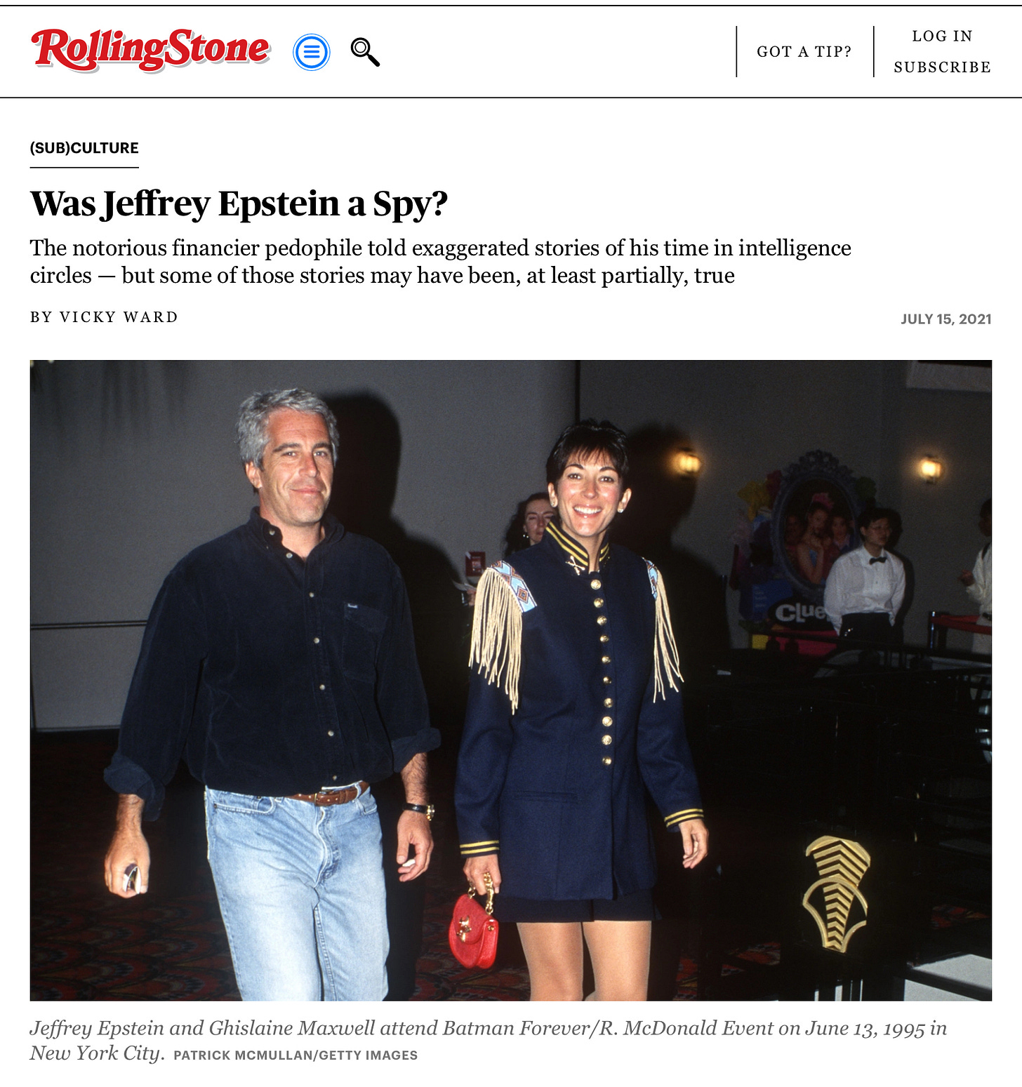 In July 2021, Rolling Stone published a provocative story on Epstein by veteran investigative journalist Vicky Ward, who almost twenty years earlier in 2002 had first reported on the notorious billionaire in another article titled “The Talented Mr. Epstein.” The backstory not revealed to Vanity Fair readers at the time was that Ward had learned that Epstein was likely an intelligence asset, a pedophile, and a rapist. After a personal visit from Epstein prior to publishing, Vanity Fair’s Editor-in-Chief Graydon Carter did not publish these revelations from Ward’s featured profile.